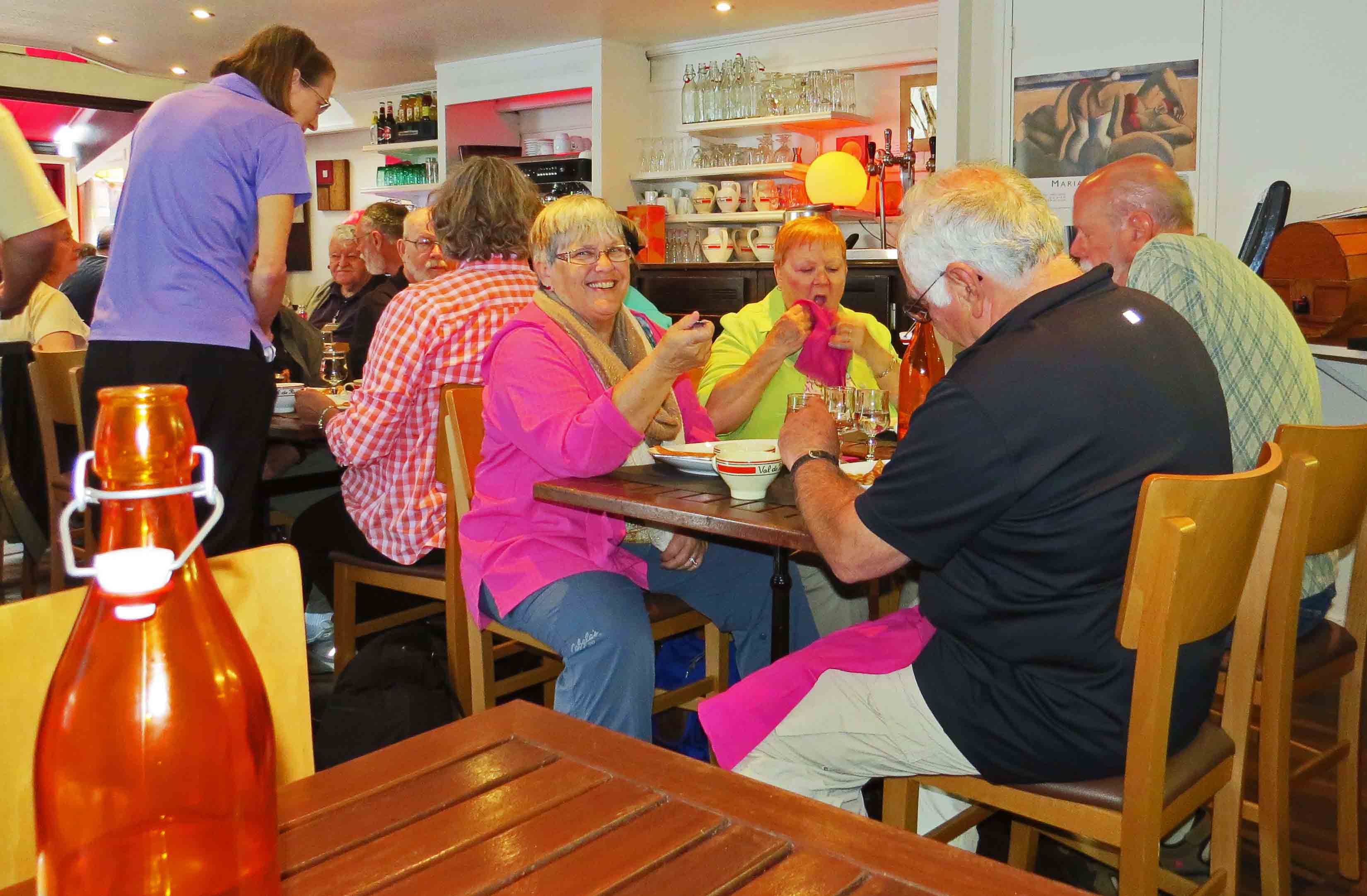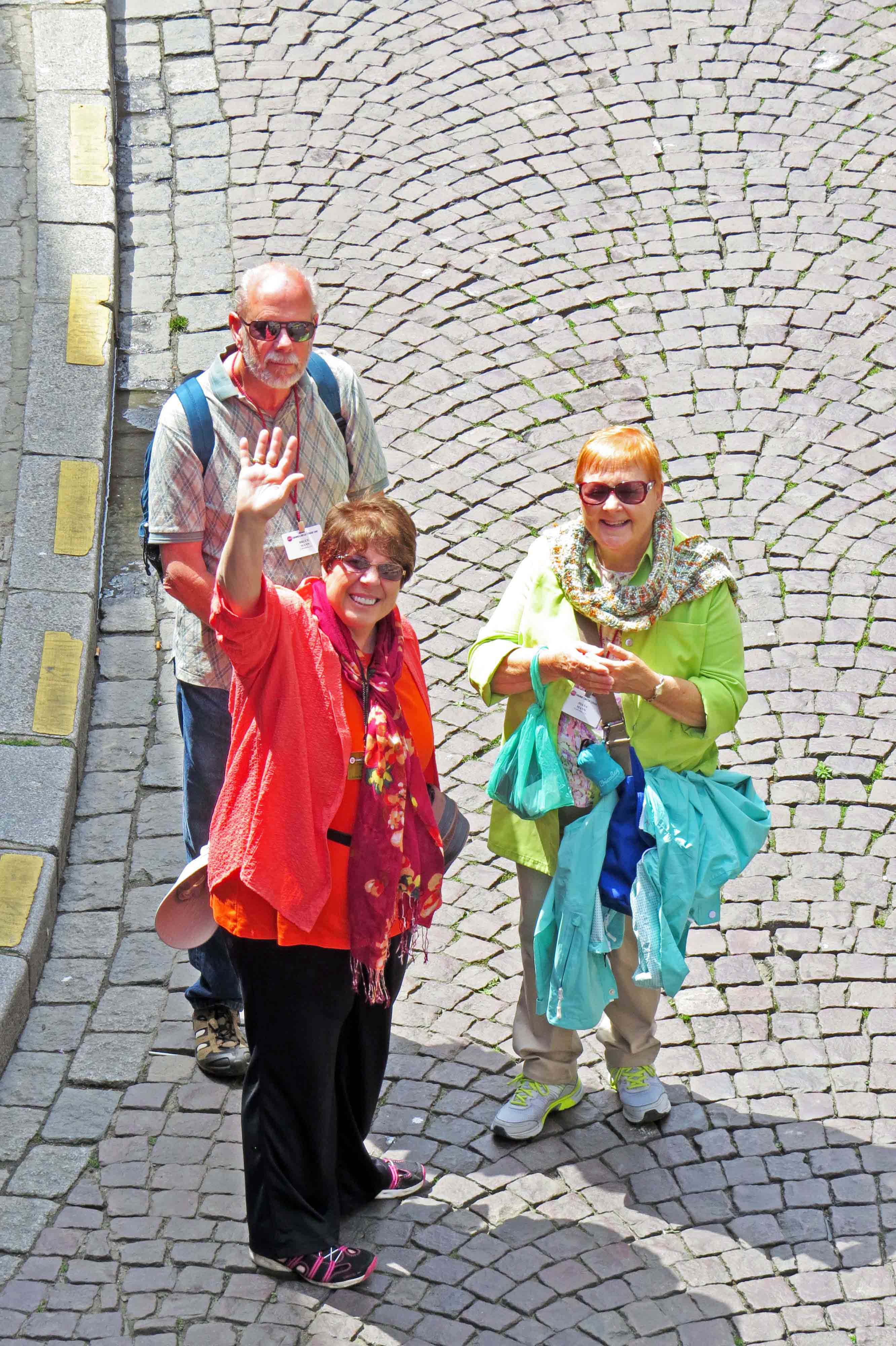 June 5, 2015 Hooray! 72 years old today and in beautiful St Malo! It can't get much better than that! Got happy birthday notes from Several good friends via email. After breakfast we boarded the bus to St Malo's fortified city. It took only a few minutes as we can see it when we walk a half a block from our hotel to the beach. We met Peter, who is an Englishman who came here and stayed in France. He has been living in Dinan but moved across the river to get on a farm and out of the city. He does the tours along this area of Brittany, especially Saint Malo, pronounced sa ma loh. Within these ancient walls lived a lot of corsairs... privateers that stole from the enemies of the king. We first visited a home of one of the corsairs; this was one of the few buildings that hadn't been burned out or bombed out. The problem was that Peter was such a good storyteller that he had almost finished his talk there when I realized I hadn't taken a single note. For you that is probably a godsend and will shorten this missive by at least a page! The gist of it all is that despite war, whether countries were trading with them, or whatever horrible problem they might have they could regroup and make a fortune from whatever they try. It is no wonder these "fishermen" lived in such mansions. The son of the first owner of this corsair home amassed over 7 million pounds of silver by selling stuff he'd stolen from other merchants. They even brought back beautiful marble as ballast. The house had 30 rooms; this corsair was traveling around the world buying and selling along the way in 1710. If countries had problems with pirates they merely hired the corsairs. I don't know how they were so successful as they rarely fired cannons at the foes. That was because they wanted the ship in good order to sell along with whatever was on board. They did have some pretty accurate guns that took out "anyone on deck wearing a hat"....officers! The rest of the crew went without a fight. I have a picture of Michael with the weapons. During WWII the only bombing of St Malo was from the Allies, and that was because of a communication breakdown. They were told there were 75,000 Germans there but there were only 75! One of the Germans there who knew the Americans would fire on them if thy thought there were so many, is credited for saving all the civilians, by hurrying them to safety before the bombs could be dropped. He is a hero to the people... name is Van Aulock. In most war memorials the soldier is glorified with a statue of a serviceman but here the statue is a widow and her son. There are many, many names of soldiers who died in the First World War but very few in the second war. At the memorial another thing they did that you don't see elsewhere was to inscribe the name of every Jew executed from that town during the war. For lunch in St Malo we went to a creperrie again. It was part of an optional trip and we had savory crapes with buckwheat, cheese, ham and mushroom and sweet of chocolate and caramel. We drank cider.. an alcoholic apple drink that tasted a lot like that apple beer Dianne drinks at the Happy Viking? We had some time on our own to walk around and then boarded the bus with Peter and headed towards Dinan. On the way we stopped at a quaint little village Peter wanted us to see called St. Suliac. This town had people who farmed rushes for thatched roofs and of course there were many people with thatched roofPeter said he looked into getting a thatched roof for his own home as putting it on is the same cost as a slate roof. He found though that a thatched roof lasts 15 to 20 years where a slate roof lasts 80 years. We passed by a house that had a little crèche built into the front wall of her house. It had been put there by the family before her. In 1856 there was a terrible cholera epidemic and the family promised if their family survived they would build it. They lived and they kept their word. When we visited the church we found there were many people that made those same deals with God and had plaques in the church saying "thanks." It reminded me of the little silver plaques sailors gave the church when they came home safely that we discovered from our last trip. At the front of the church there were nine statues. Some parishioners removed them before the French Revolution. and hid them to protect them from being ruined (as they were from the thirteenth century.) 70 years later when they wanted to restore the entrance, only five could be found. They put up what they had and put up two more of that time. One looked very much like the priest at that time,.. Father Joseph. He must have felt pretty important up there with Saint Peter and Virgin Mary! I have included the photos of this. There were many beautiful little home and gardens everywhere. It was such a pretty little village I will send a few from the hundred Michael took if this place. We loved the flowers and the beautiful lace curtains in the windows. The fishermen, who were more like ship owners would have their little boats painted and then use the rest of the paint on their shutters, ergo many colors of shutters in the town. We then boarded the bus for Dinan. This is a medieval town with churches, clock towers, and ramparts to protect those in Brittany from the Parisians. Peter assured us we could NEVER get lost and they reminded us if we thought we were lost just ask to go to the gerendame! We of course took a wrong turn and were thinking we could get back but decided to ask for that police station which was by the bus. What we didn't know was the gerendame had been moved some time ago to the other side of town, but didn't bother to take their sign. People kept pointing the other way from where we had to go. Finally we backtracked and found our way back but that was after 35 minutes of walking up and down curvy cobblestone streets. It was an INTERSTING way to spend my 72nd birthday. Needless to say, I nixed the 30 minute round trip walk to the oth