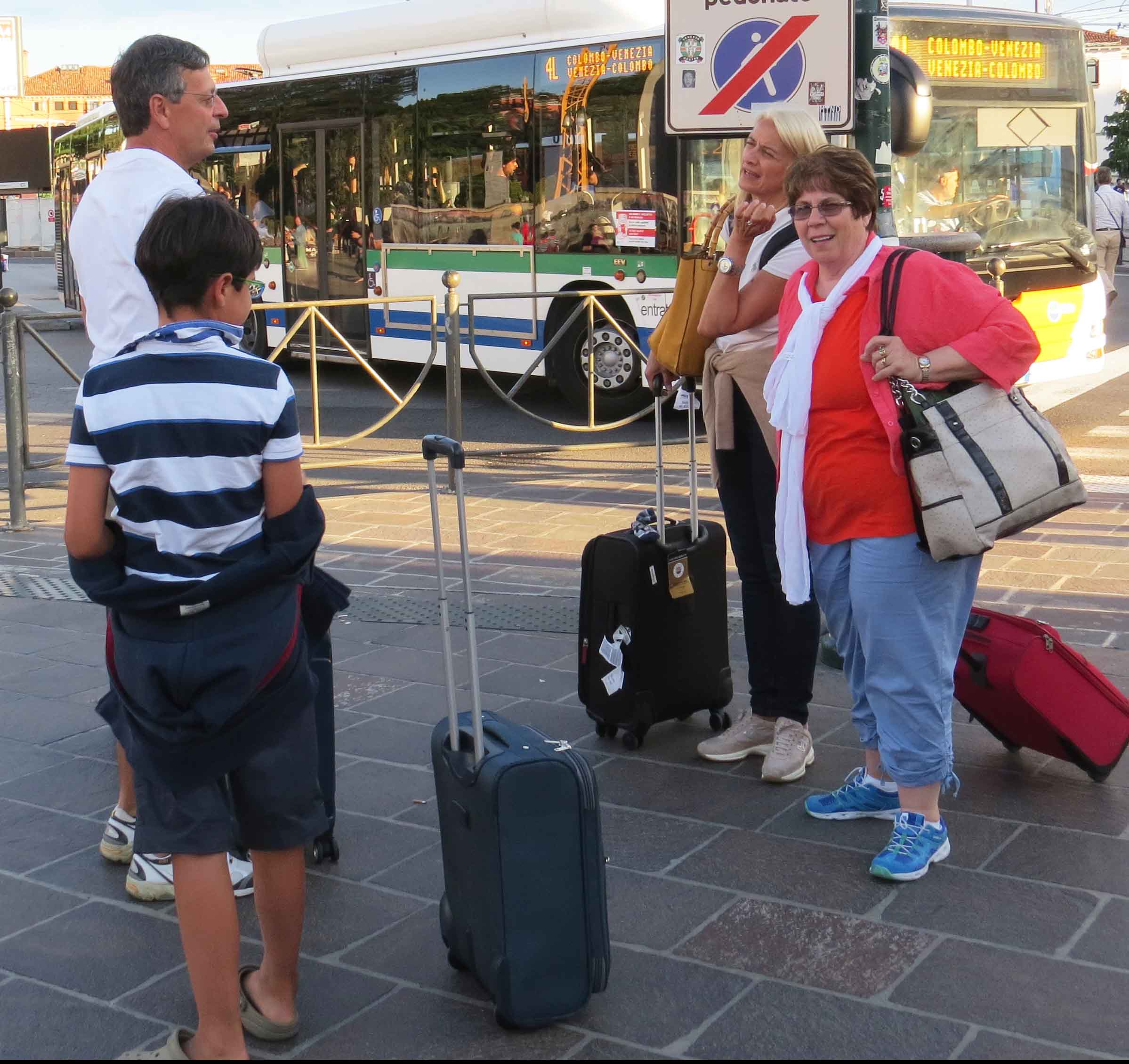 June 20, 2015 Venice We got our taxi to the airport and with an hour to spare we were at the airplane. We thought we were way ahead of the game, but our carry-ons were too large for this smaller plane so we had to back-track and check them. We were afraid we'd be charged another 60 euro but they went for free. It did make us the last to receive our luggage in Milan and Carlo and family were beginning to wonder where we were. When we came out Carlo said, "we are going right now to Venice and will stay overnight and show you around. Sylvia, Eduardo (Dodo), And I sat in the back and Sylvia was great at talking with me. She does not talk in English much but she did really well and could be understood great. We parked the car in an overnight place and took a water taxi to their nearest oft in Venice. After taking our suitcases (left one in the car to take back to Saliche) we came to their flat. It is just marvelous! Two bedrooms, a big living room where they have a pull-out king-size couch, a darling kitchen, and two bathrooms on the first floor. We leave the windows open and get the good Venice air. It is quiet, but not far from a great campo (small square with water well at the center). Their district is San Crose (holy cross). We followed him to a nearby restaurant they like to go to. We ate outside and I had gnocchi with Gorgonzola and an appetizer of stuffer fried zucchini flowers. Dodo had the same with a pomodora sauce and the rest had fish or calamari. Dodo wanted panna cada for dessert but the rest wanted to go to one of the hundreds of gelato places. I was too full even for coconut gelato, but made sure I knew where the place was for another day. We needed to walk off dinner so took a maze walk down corridors, across little bridges with so much twist and turns I was totally lost. Being Saturday everyone on the island was also taking in a walk to enjoy the amazing views Venice offers. We came home and had the best sleep in a long time. Goodnight from Venice. Even though I don't have wi-fi to send this now. That is something we will do tomorrow. Grove