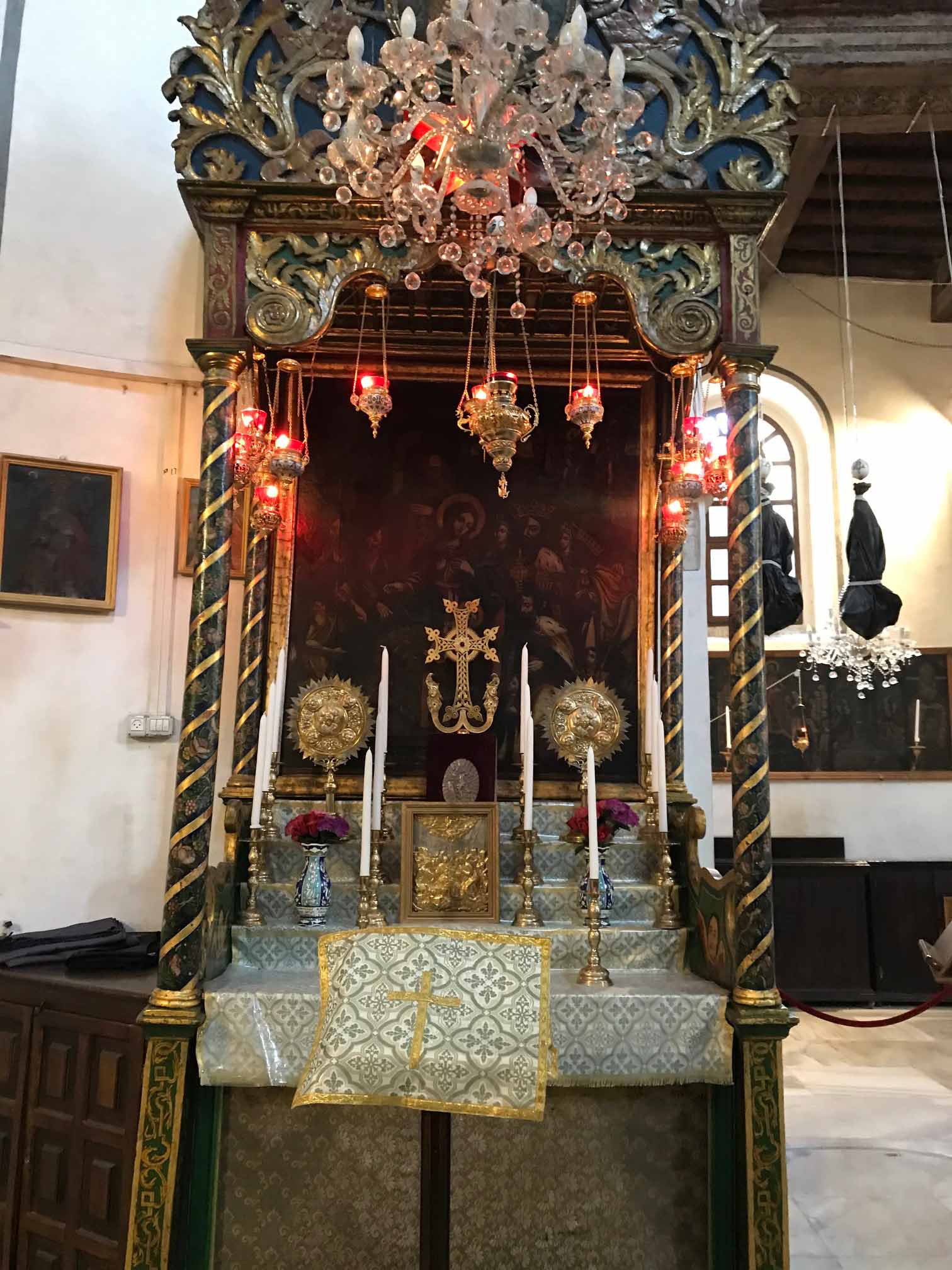 By then it was time to backtrack to Bethlehem. Mustafa had showed us the three hour line large groups must stand in to see the star where Christ was born and the place where the crib was. We all knew we couldn't stand that long but Mustafa had a plan. He took four of us: Linda, Gary and Michael and I through another doorway through the Armenian Church. He had Michael hold my hand like I couldn't walk easily. That ended up to be the Royal truth as each step down to the star was at least twenty inches deep, and dark, and I nearly toppled. The star is down in a small under ground grotto. We think of Jesus being born in a barn, but the barns in those times were a lower level, beneath the inns or homes, where the animals were kept. I put my hand on the star and crawled over to where the crib was situated. At one time the actual star that marked the place was stolen, but it has been returned. There is plenty of security now and besides it would be hard to take with all the pilgrims lined up waiting. We then went inside each of the three churches that share equally that part of the grounds: a Russian Orthodox Church where the line is and the entry from outside, the Armenian Catholic Church where the back way there is located and the Roman Catholic Church which is the biggest and somehow wraps around with no exact entry. When we entered the Orthodox Church we could see the huge lines of Pilgrims lined up circling the church and even going outside the church into Manger Square. That small square is where Christmas is celebrated on TV every year. Each Church celebrates at a different time. I know that the Catholic Church celebrates on December 24th. Another's is January 8th and one on the 17th I think. There is a much larger square beside it with the shops, The Orthodox Church, and a Mosque circle it.