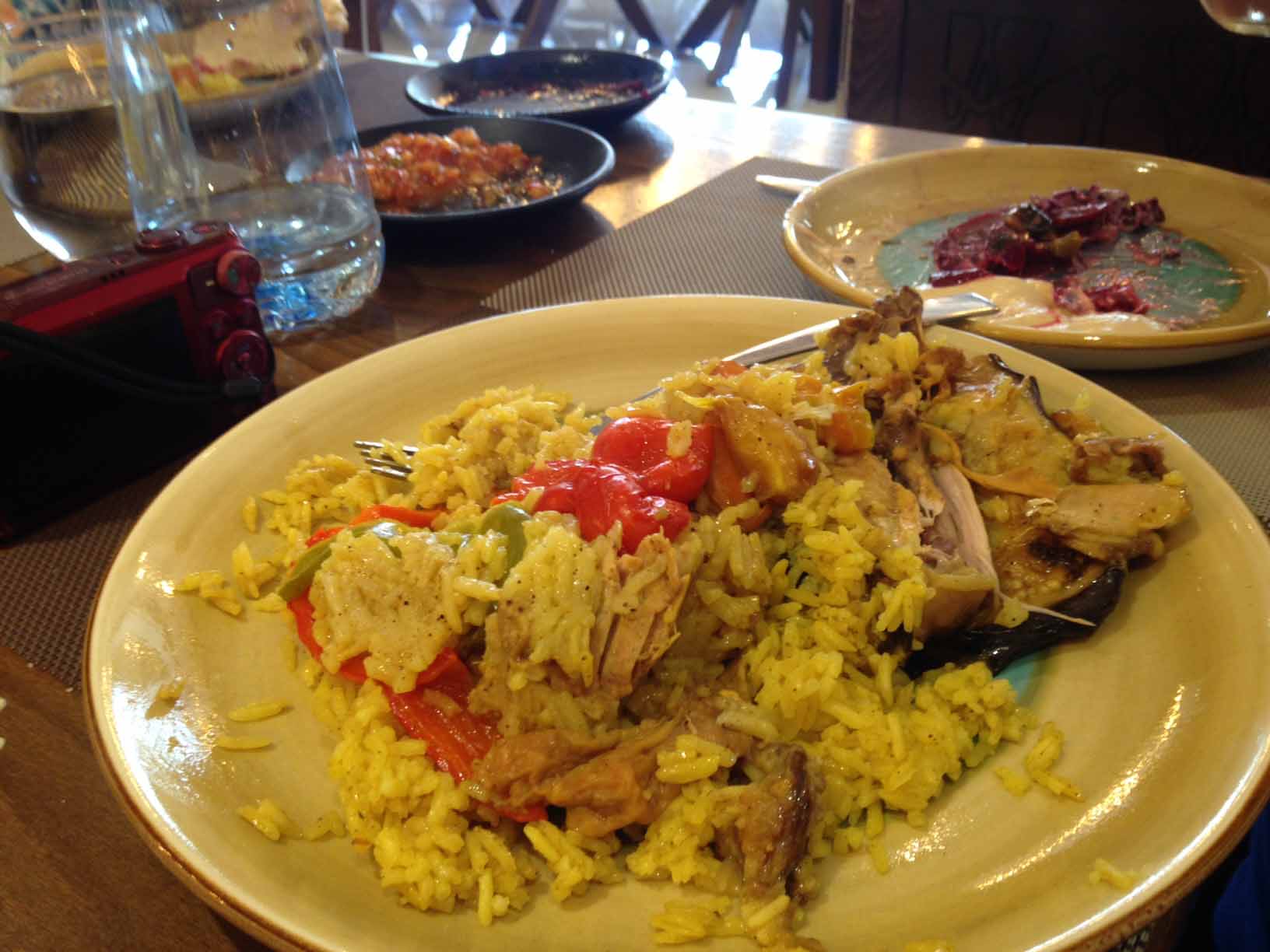 The last few days seemed to blend into one, but now I feel better and have some extra time in the room to tell something about yesterday, besides the visit to the Bedouins. On our trips around Judea we saw a huge man-made mount or hill. We found that it was made by..no other than that same old guy Herod. It is believed that he died in Masada, but wished to be buried in Judea by Bethlehem. This mount was believed to be his resting place. When it was finally excavated by professionals what did they find? Herod's tomb.......but totally empty! I guess he got the last laugh. I'm sure he was so paranoid he feared people would dig him up and he didn't want that. Good trick! The place is referred to as Herodion. For lunch we stopped at Petra.....not the one in Jordan, but the restaurant by that name. They had a feast waiting for us: Olives. Purple slaw, vegetables, beets( my favorite), peppers, hummus and pita bread. I had a small piece with a bit of hummus but mostly I ate beets until the main event came....and it was pretty amazing! It was called" UPSIDE-DOWN". and was prepared...rather served... right in front of us. There was an enormous pot like the have at the school cafeterias. Two men took it by the handles, and BAM!!! Turned it upside down on a platter in front of us. As we watched one guy lifted the pot and out tumbled many pieces of chicken rice with curry and saffron, and red peppers. The tried to give me a plate piled high but I asked for "little,little" and I got a fair amount of rice with a leg and thigh. It was cooked perfectly and for the first time in days I ate.