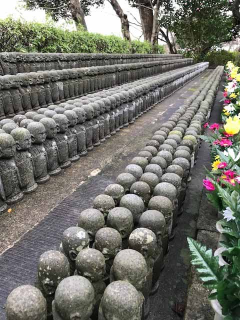 Since it would be lunch and dinner and since my sweet roll and milk didn't hold, I ordered a big meal for 1700 yen. There was salad, miso soup, cold noodles to dip in a broth with soy and onions, a small but good and fresh salad, tempura of shrimp, sweet potato, and eggplant and rice with soy sauce. They also serve a tiny dish of something pickled. I loved the tempura and salad. But the other was just ok and I left some of each. From there we walked up the hill to Hase Kannon . It is a shrine with Buddhas that protect children. When a baby dies the parents buy a small statue that they take there and at times of the year they decorate the statues with pinwheels, flowers, bibs, etc, they ask Buddha to love and protect them in their next life. Michael took pictures of the rows and rows of those statues. And we both took pictures of the area.