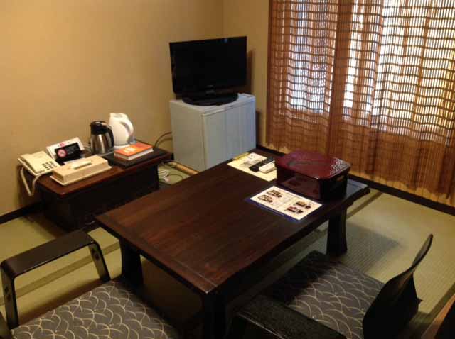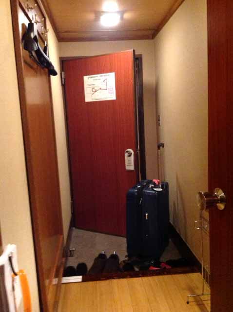 We caught the green line on the JR Train line which is that comfortable one we get free with our rail pass. We were the only ones in the eight-seat car. We rode that all the way to the Ueno Station and got a cab to the hotel. It is a typical Japanese ryokan with futons on the floor. I am lying in one now and I must say it is much softer and puffy on the top than the bottom. I haven't had to get up out of it yet, but I think it will not be pretty. I took a picture S we have an entrance room....where you change shoes, a toilet room, a sink area, and a shower with a wooden tub next to it. We then have one large room with a short table and two chairs and a short divider with two futons on the floor, We have a big closet for our suitcases and although the lady at the desk assured me there is Wi Fi everywhere in the ryokan, it is slow to non-existent in the room. Still I am after the experience and am getting that in spades!