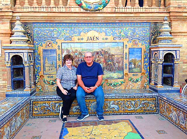 Journal No. 14 Wonder Sevilla! The land of fans, castanets, and mantilla! Home of the third largest cathedral in the world, the flamenco and my favorite, the expo in 1929 for the Latin countries. After breakfast we boarded the bus for a city tour. The best stop was at the the expo. It is a half circle with a fountain, a stream, bridges, and two big towers (one for Isabella and one for Ferdinand). All around the semicircle were little venues from that area, with little shelves on each side for pamphlets of information. The pictures which tell about them are beautiful....I have included those tiles as it is hard to write and give them justice. There are many, but I chose a few of my favorites. Cordoba and the 1929 Expo for Latin American Countries were my favorites. However, in reality, having Victor and all my other wonderful fellow travelers really made this trip! 1929 Expo for Latin American Countries