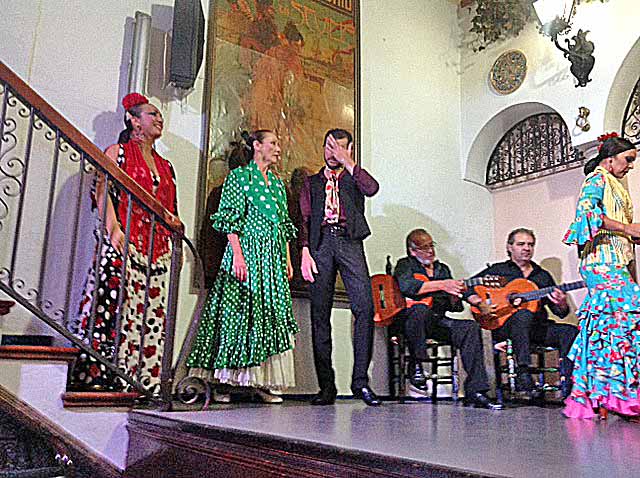 We continued to see the city and all the pavilions from all the countries that are or were Latin......even USA, the Golden Tower, the bull ring, and the Flamenco place we went to tonight. What a show!! Flemenco Dancers of Sevilla A display of their dresses and staged dance numbers